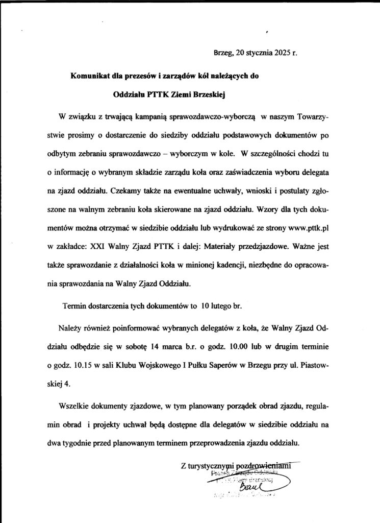 Komunikat dla prezesów i zarządów kół należących do Oddziału PTTK Ziemi Brzeskiej