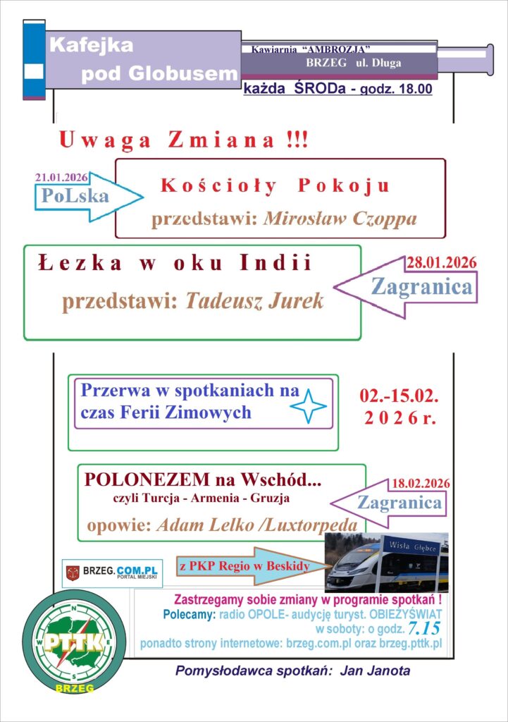 Ambrozja (3) autokar (17) bazylika (1) biuro (1) Dolny Śląsk (3) Jarzębina (5) kafejka (4) kafejka pod globusem (1) karp (1) katedra (1) koniec sezonu (1) Konkurs Krasomówczy (1) Koło Jarzębina (2) Koło Obieżyświat (2) Kraków (2) lokalizacja (1) Małujowice (1) Nysa (1) Obieżyświat (4) ognisko (1) Piotrowice Nyskie (1) poznajemy polskę (1) PTTK Ziemi Brzeskiej (1) relacja (4) Rynek (2) Spisz (2) spotakania turystów (1) Sulejów (1) szkoły podstawowe (1) sztolnia (1) Słowacja (2) termy (2) turystyka (2) Uniejów (1) Warszawa (2) Wawel (1) Wielkopolska (3) Wrocław (2) wycieczka (15) Zabrze (2) za granicą (1) zaproszenie (15) Ziemia Łódzka (1) zwiedzanie (6) Święto Karpia (1)
